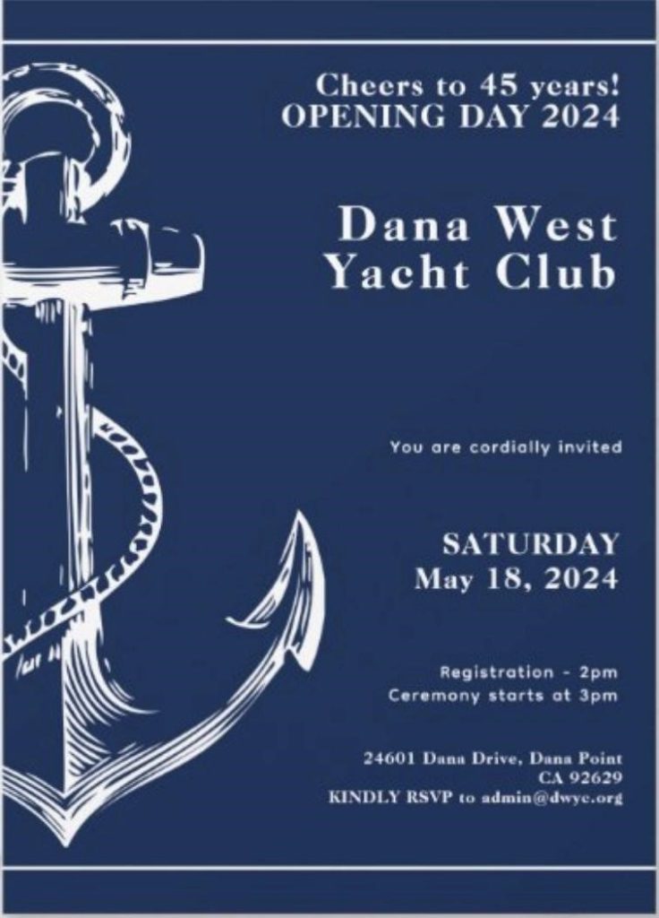 Mark your calendar for May 18, 2024 for Opening Day. This year we will be celebrating the Club’s 45th anniversary! We will be having the Boat Parade in the morning with Opening Ceremonies commencing at 3pm. Please reach out to Fleet Captain Greg Carlson about joining the super fun Boat Parade. Greg can be reached at fleet@dwyc.org. Don’t miss this special occasion!
