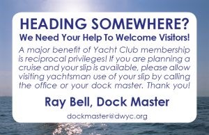 Remember that when you sign-up to leave on a cruise your slip may be used by another visiting club boater. Any and all changes you make must be communicated to the Fleet Captain and Dock Master.